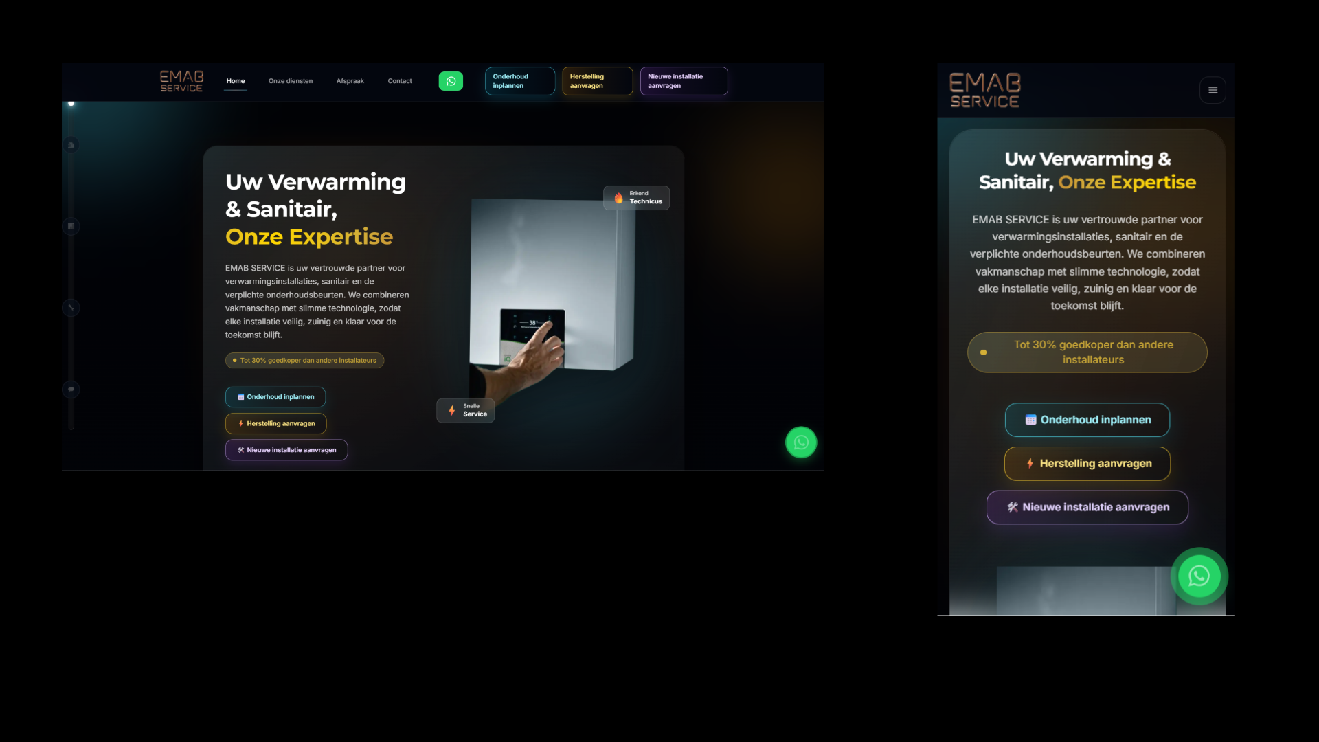 Website voor verwarmings- en sanitairbedrijf in regio Antwerpen. Diensten (onderhoud, herstelling, keuring, gas omschakeling), online afspraaksysteem, reviews en CTA's voor contact.